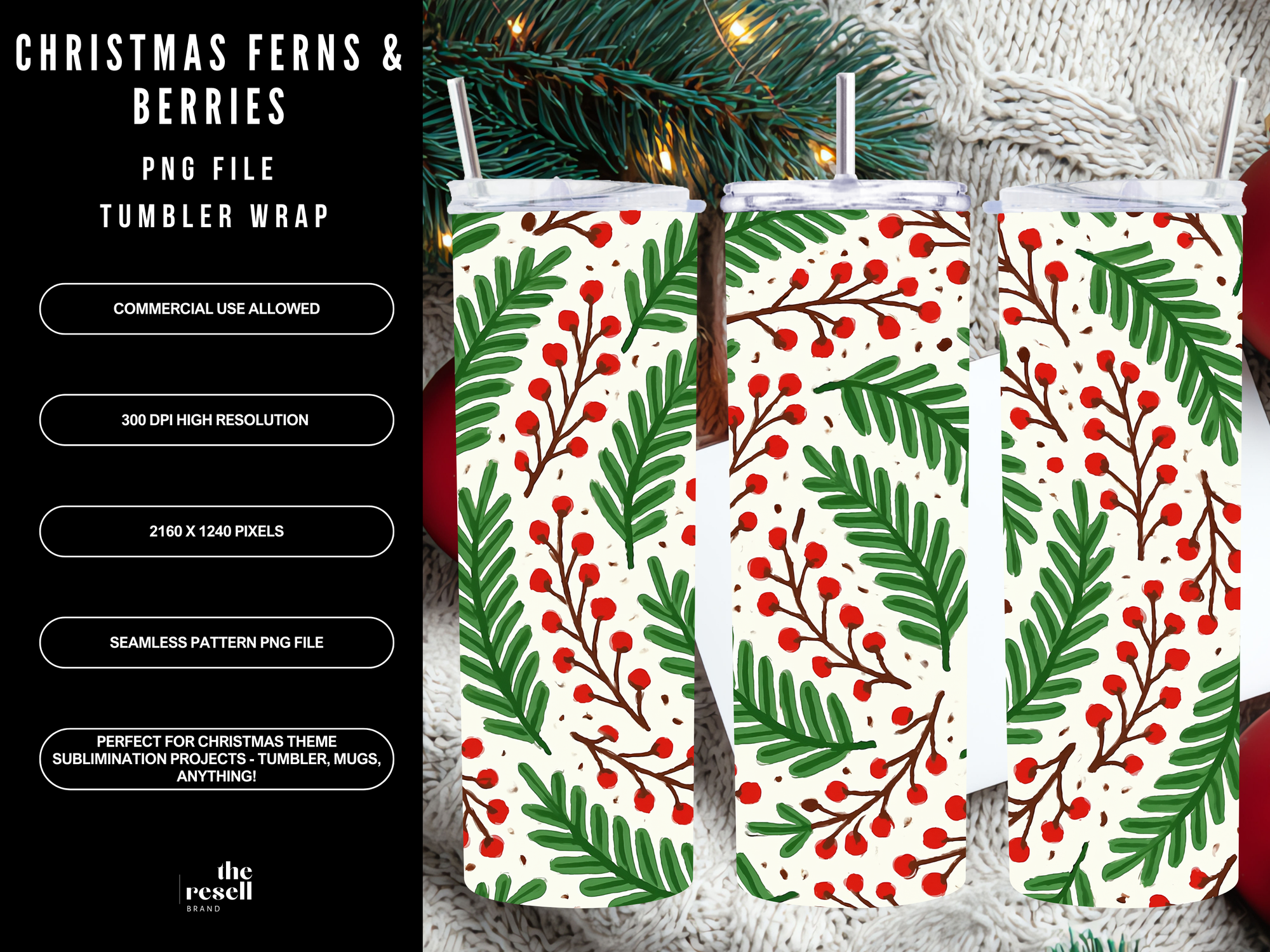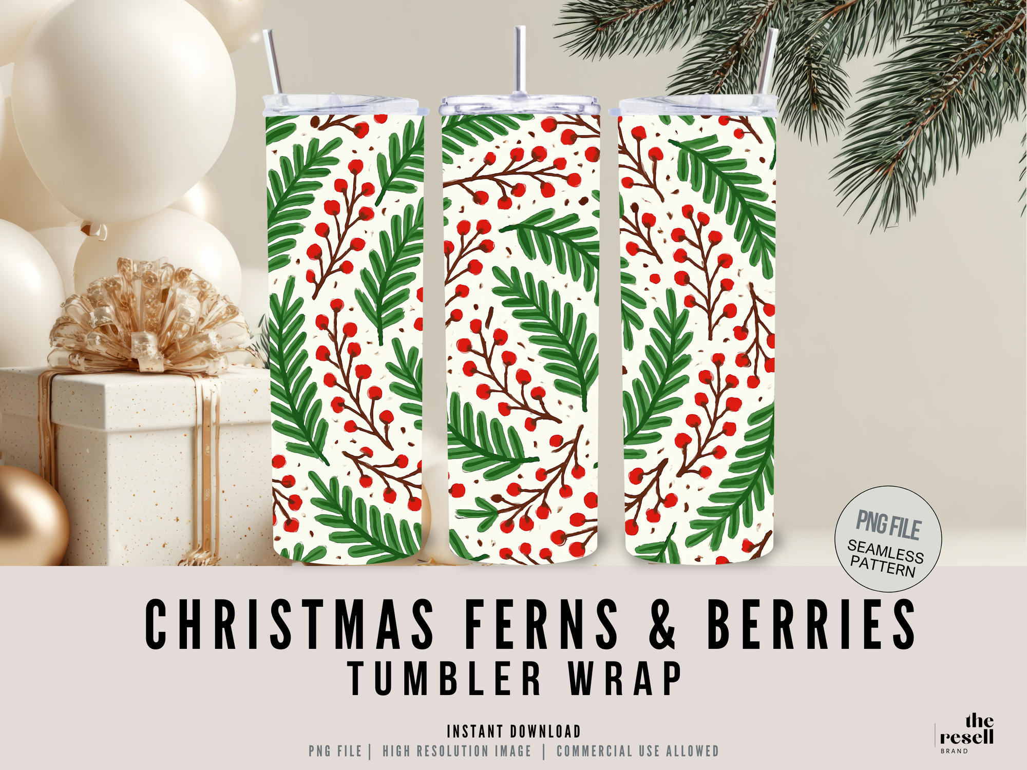 Christmas Ferns & Berries Tumbler Wrap PNG | Cozy Winter Seamless Pattern | Holiday Sublimation Design | Commercial Use
