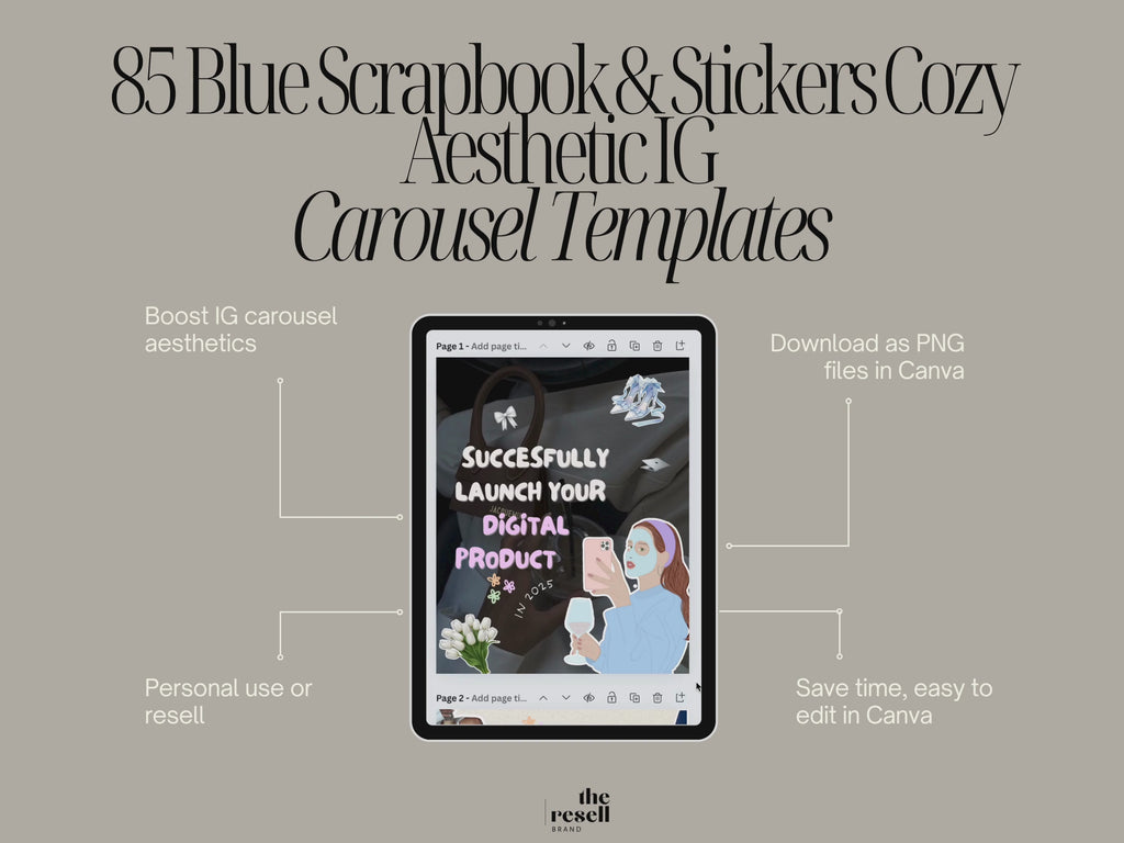 blue ig templates, scrapbook carousel, cozy canva kit, mrr templates, plr carousels, aesthetic blue, editable ig posts, canva carousel, sticker templates, soft ig graphics, instagram kit, cozy content, resell template kit