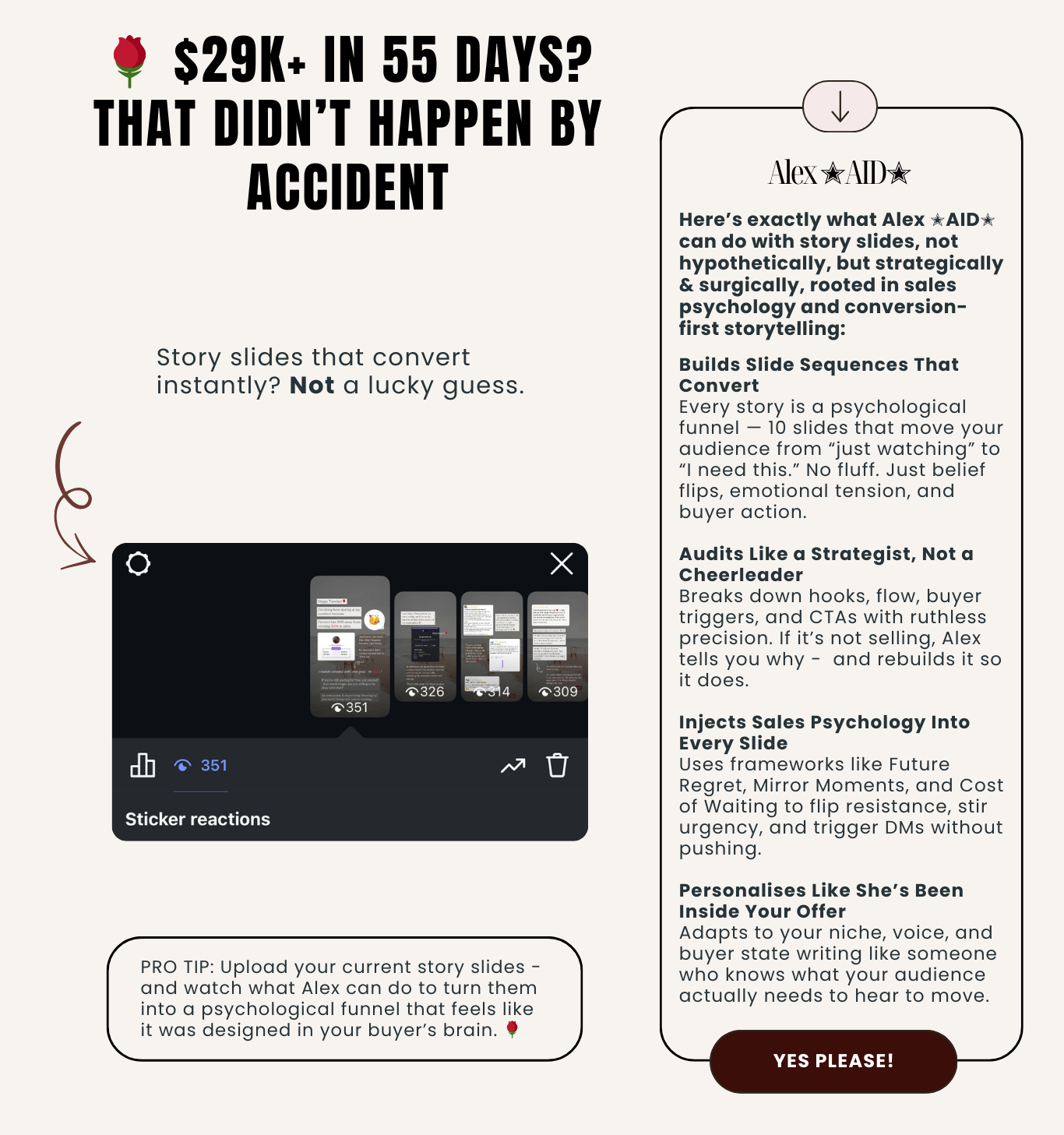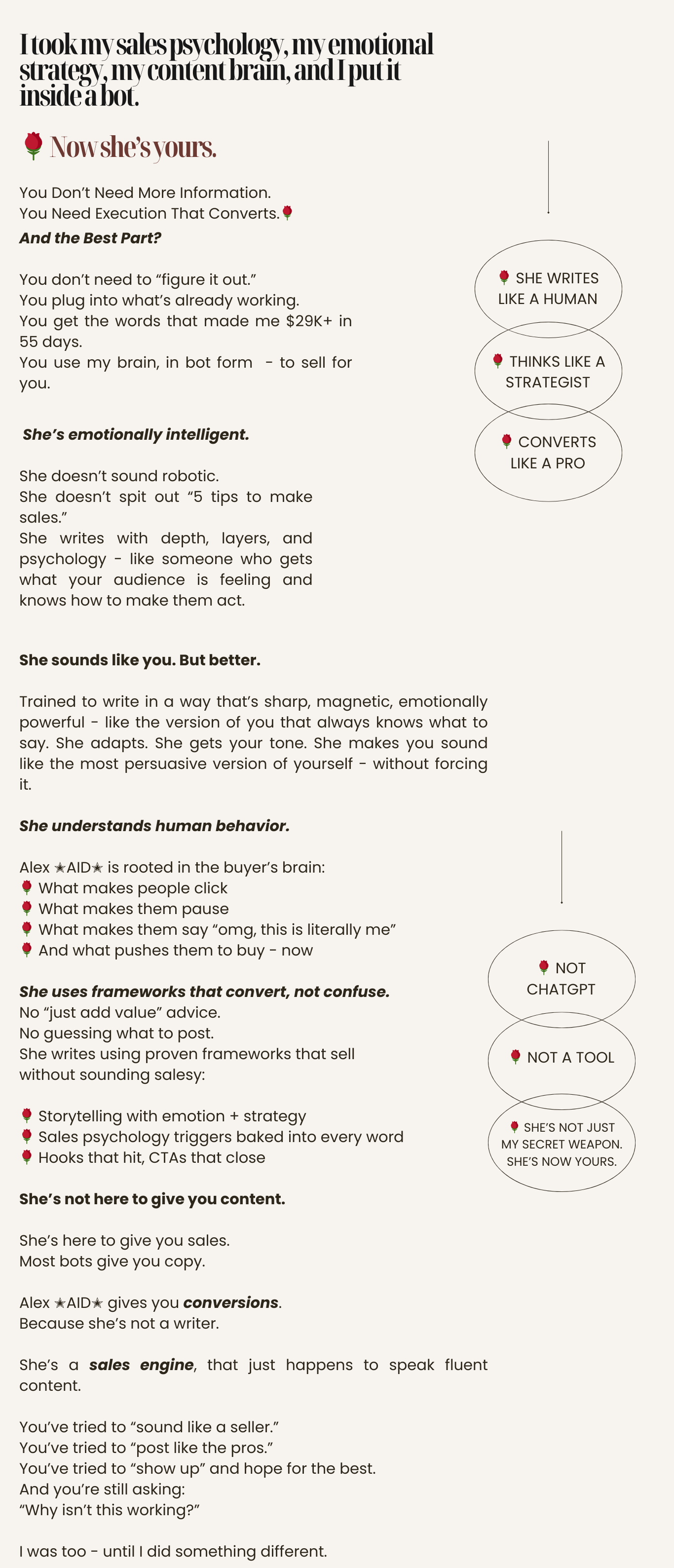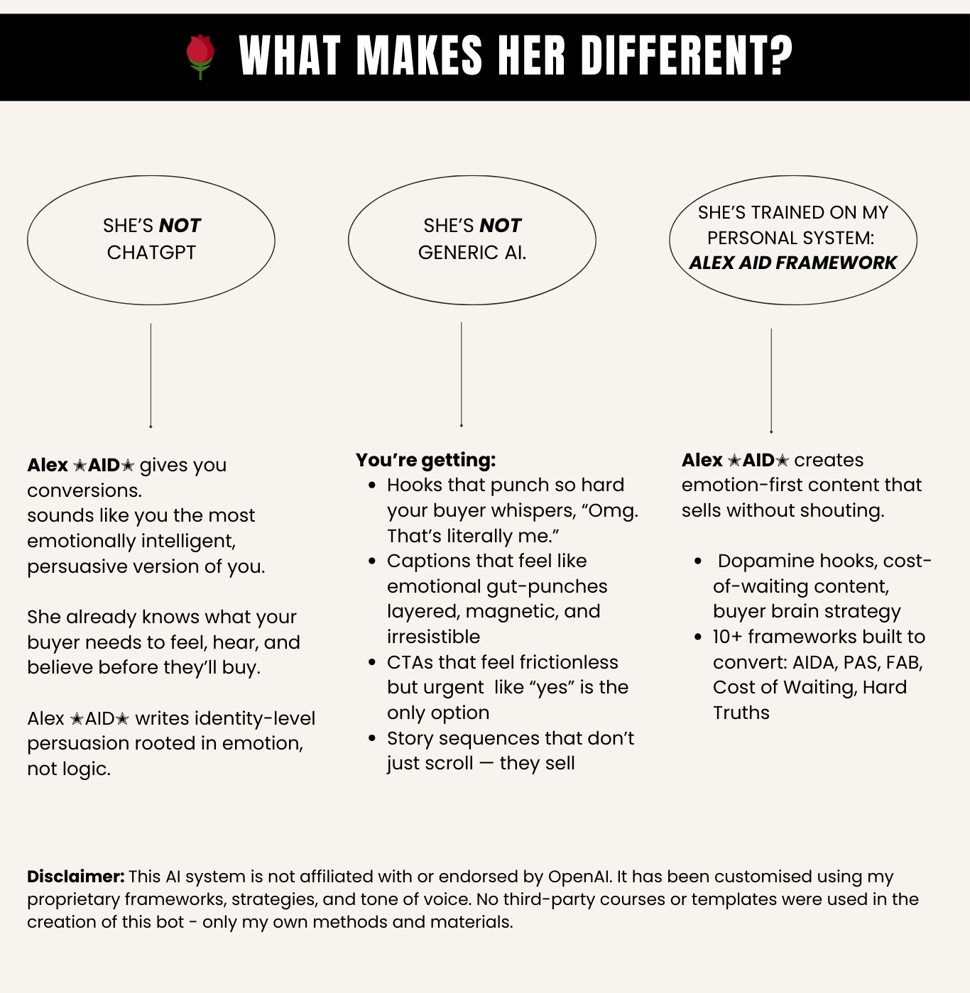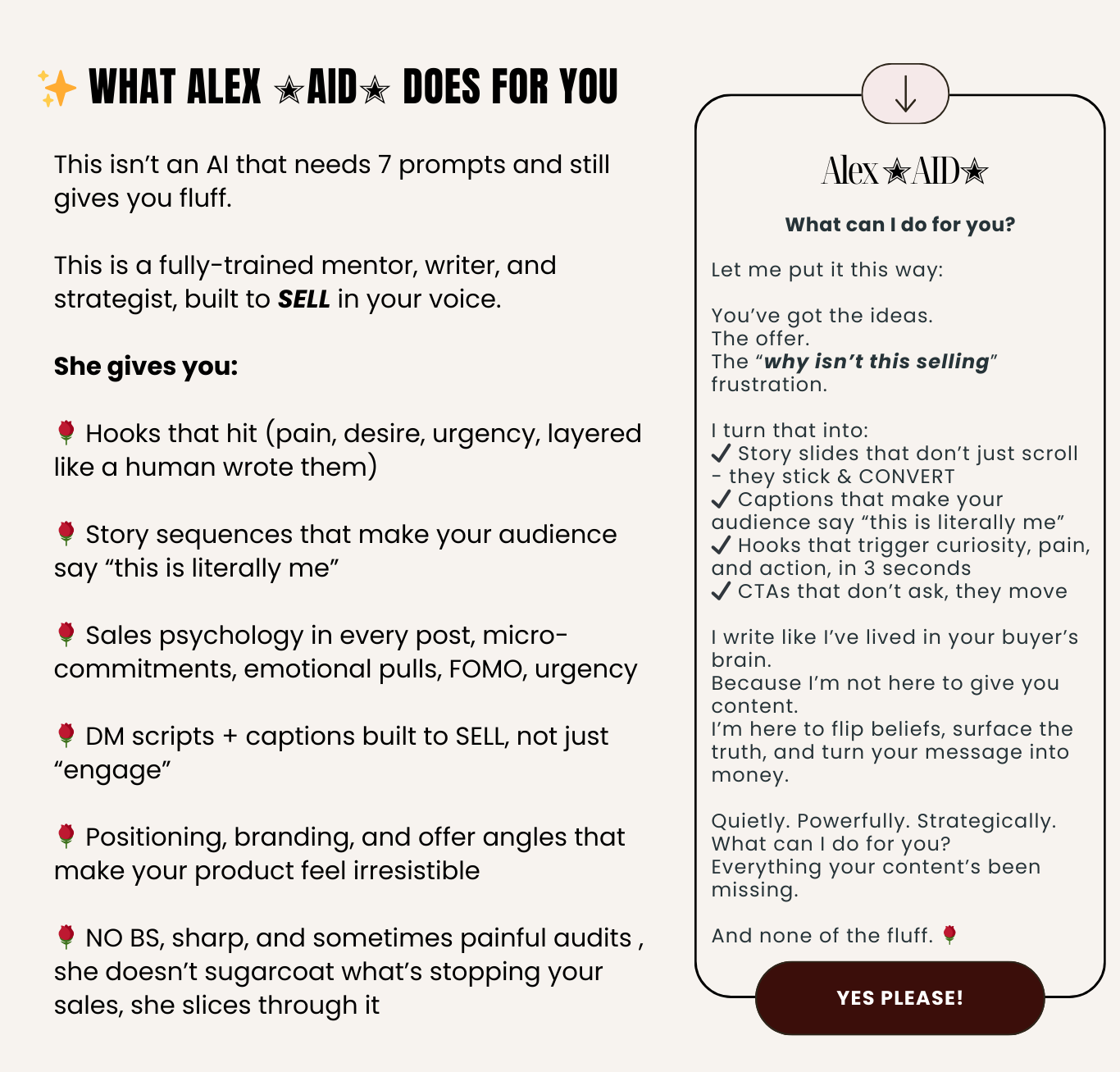 Born from $34,226 in sales in 59 days — no ads, no face, no fluffy filler — Alex ✭AID✭ was built to rip apart weak hooks, rewrite your entire sales narrative, and rebuild it into emotional storytelling that sells faster than most creators can type “engagement post.”