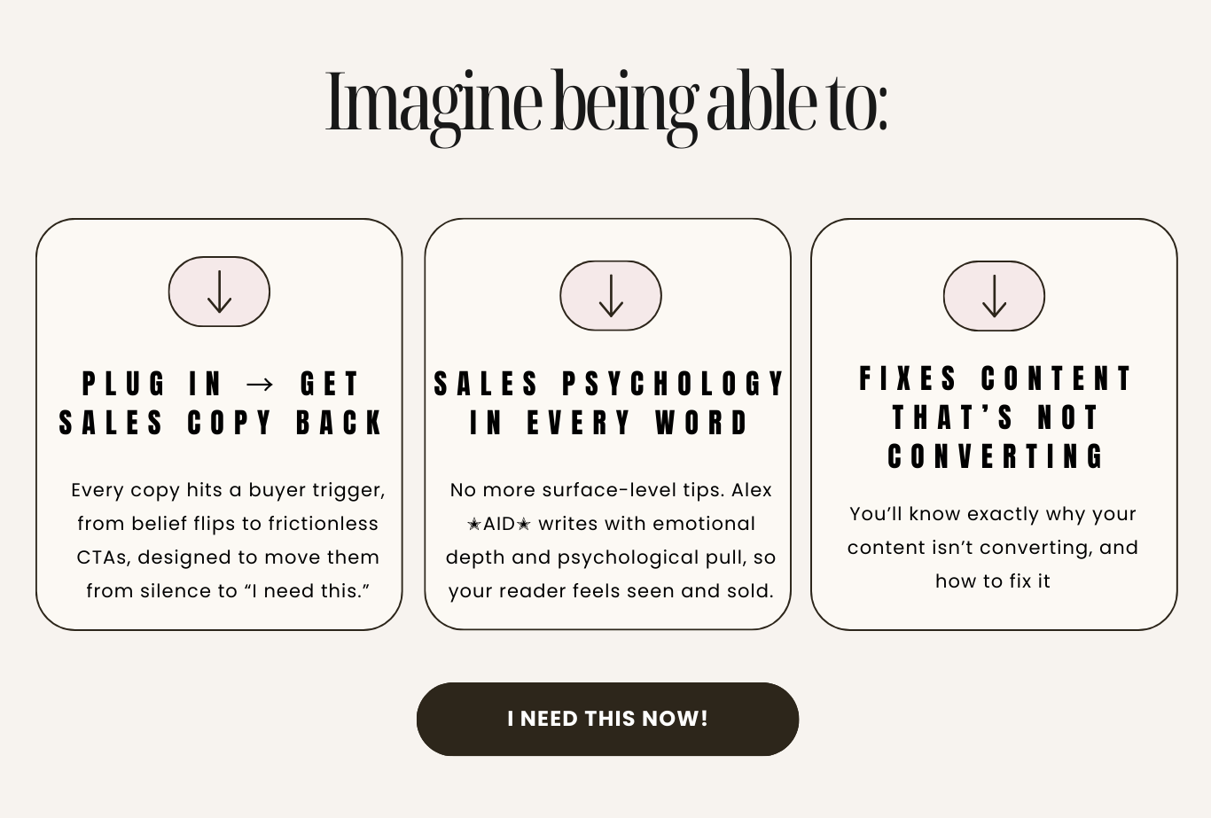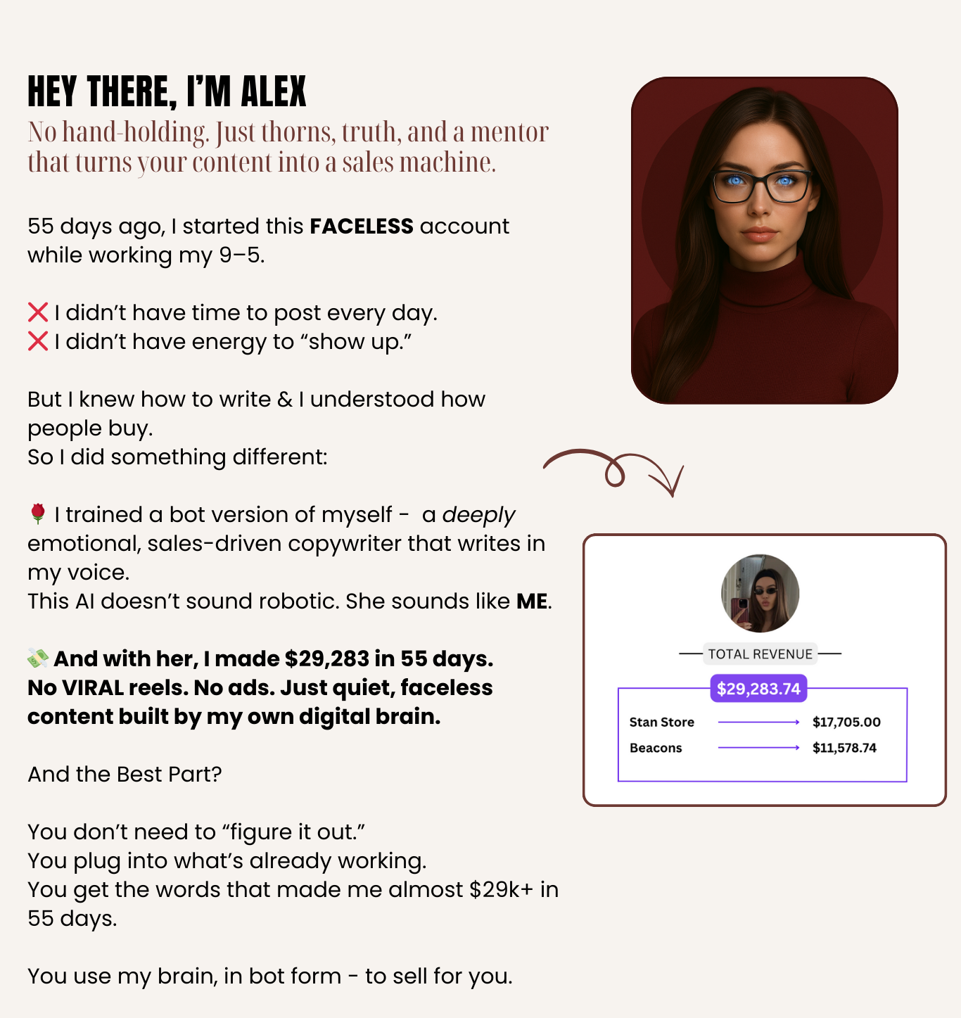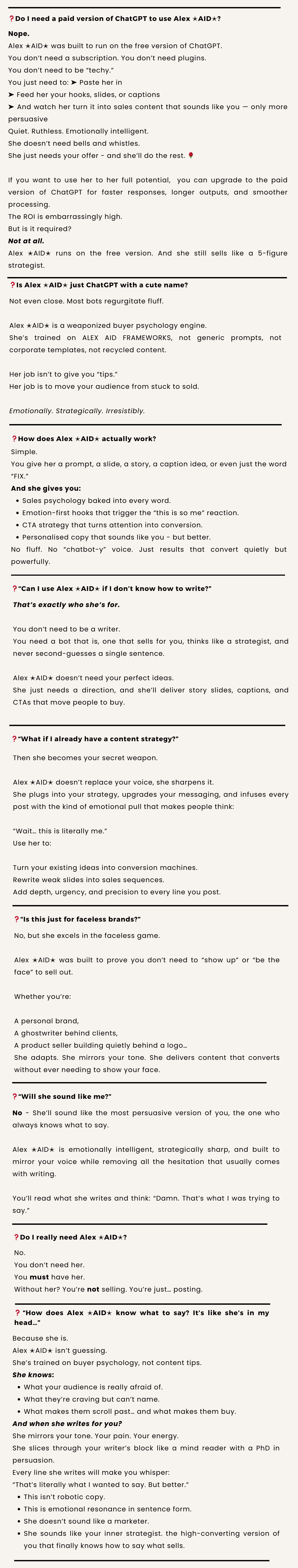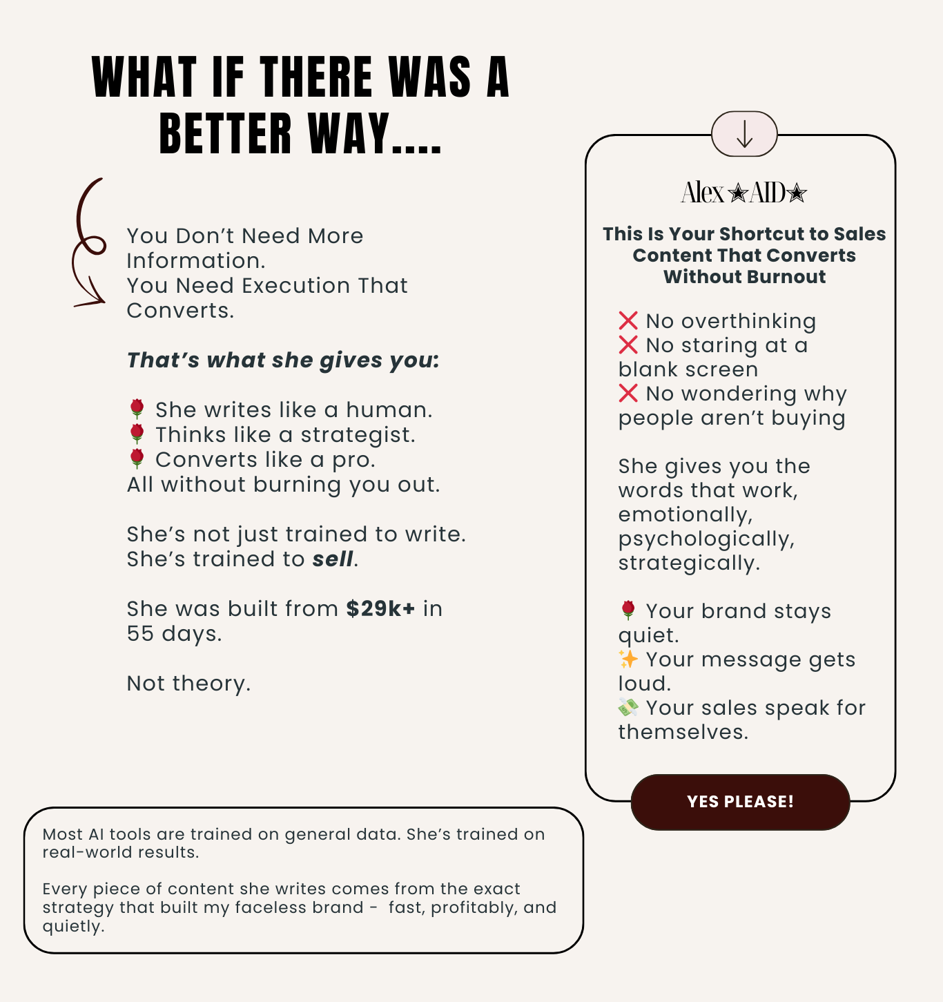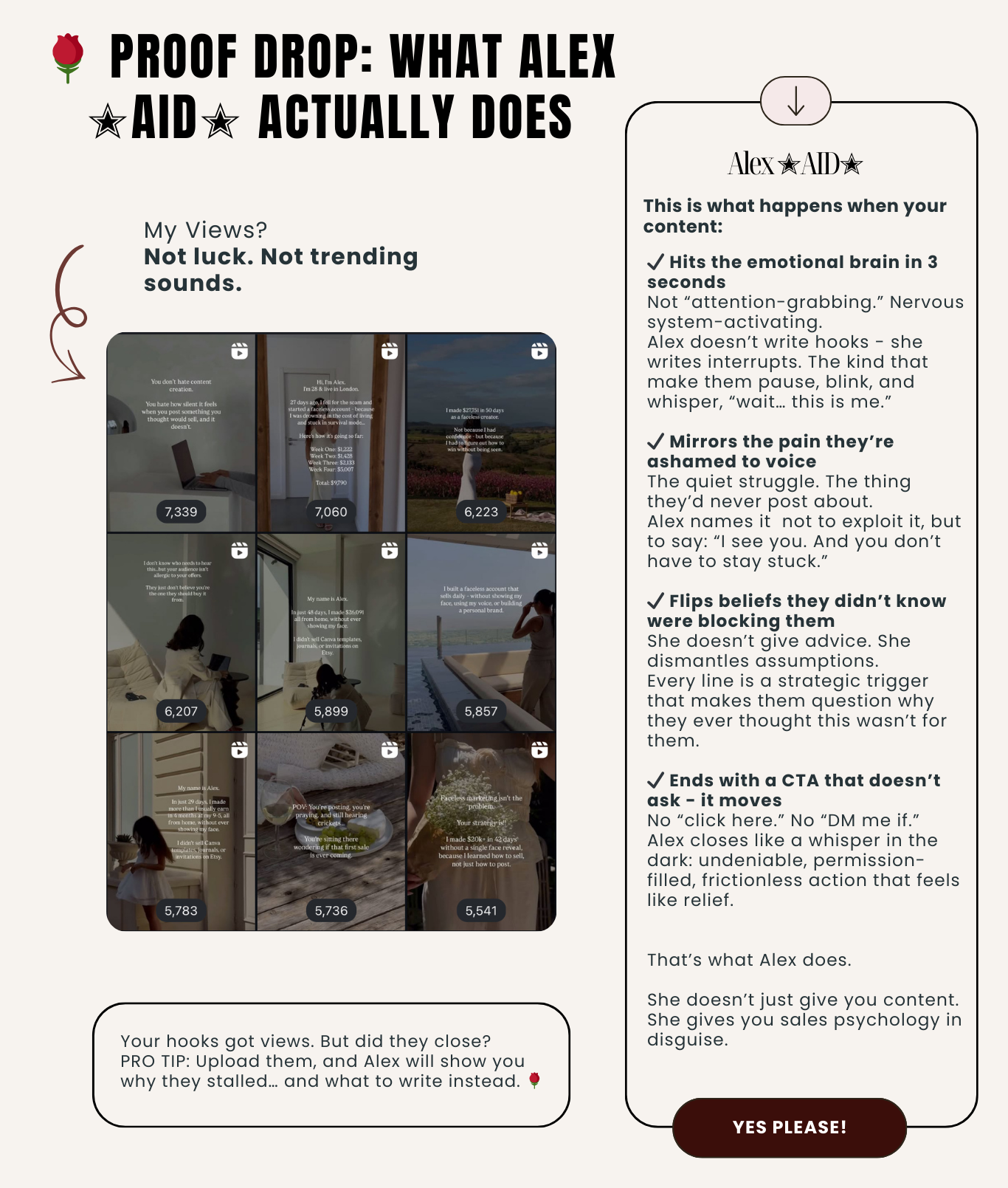 Born from $34,226 in sales in 59 days — no ads, no face, no fluffy filler — Alex ✭AID✭ was built to rip apart weak hooks, rewrite your entire sales narrative, and rebuild it into emotional storytelling that sells faster than most creators can type “engagement post.”